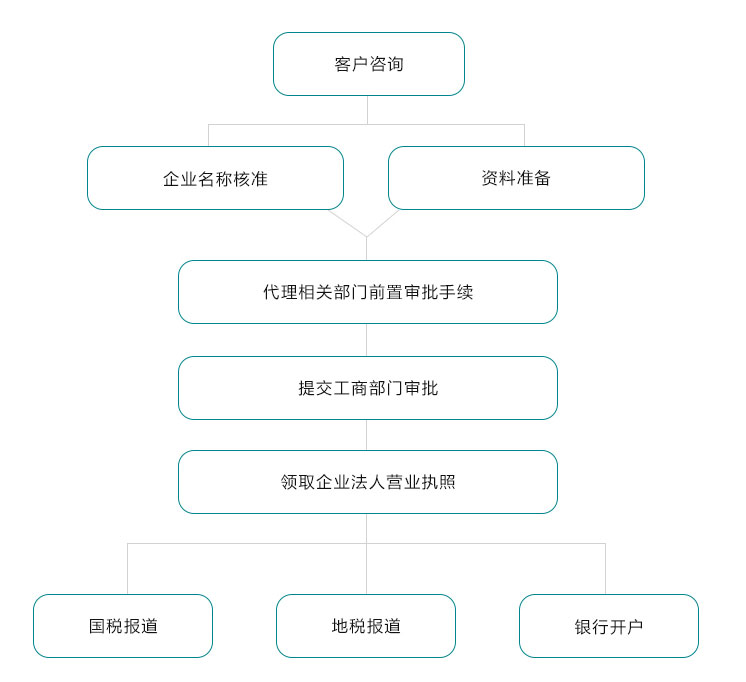 ①公司名稱核準      ②起草公司章程      ③提交注冊申請      ④領取營業執照